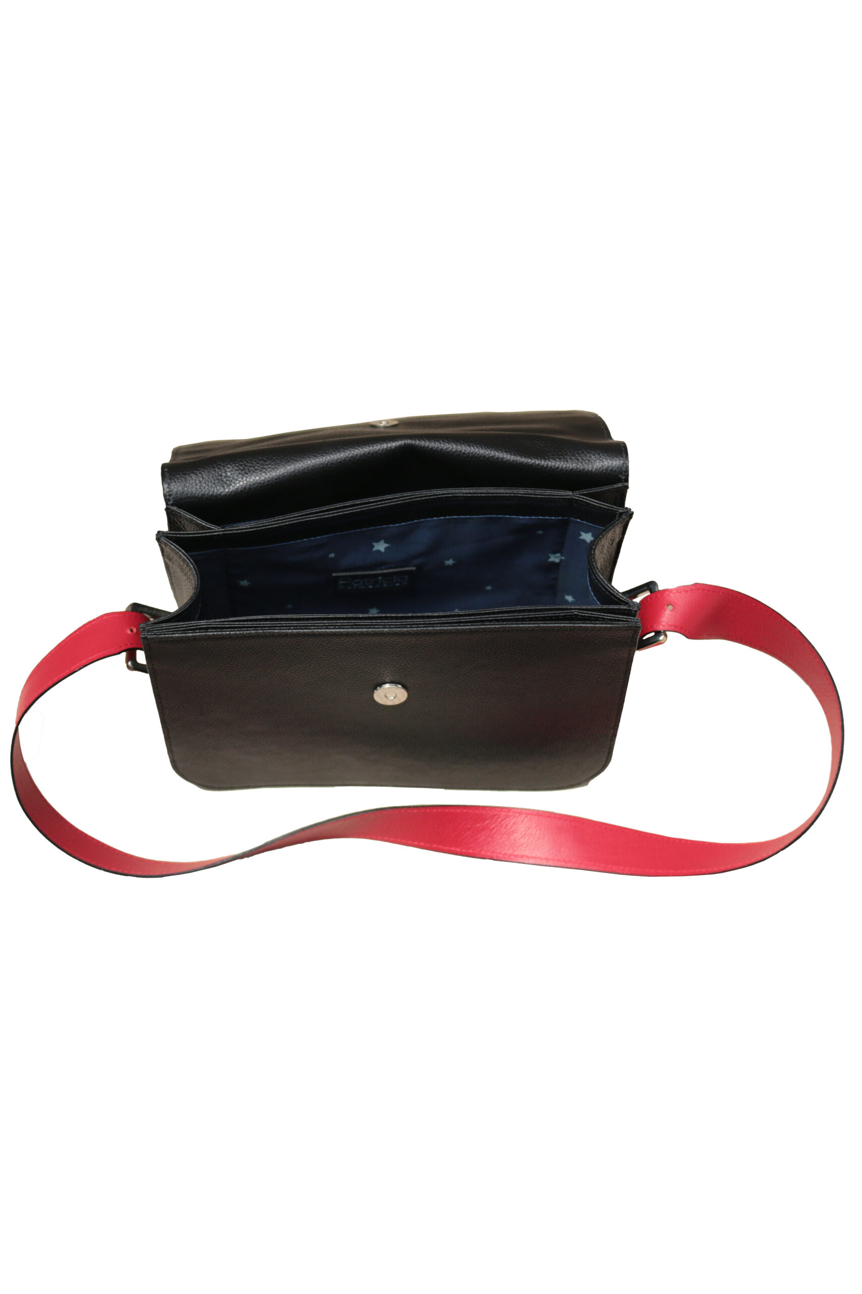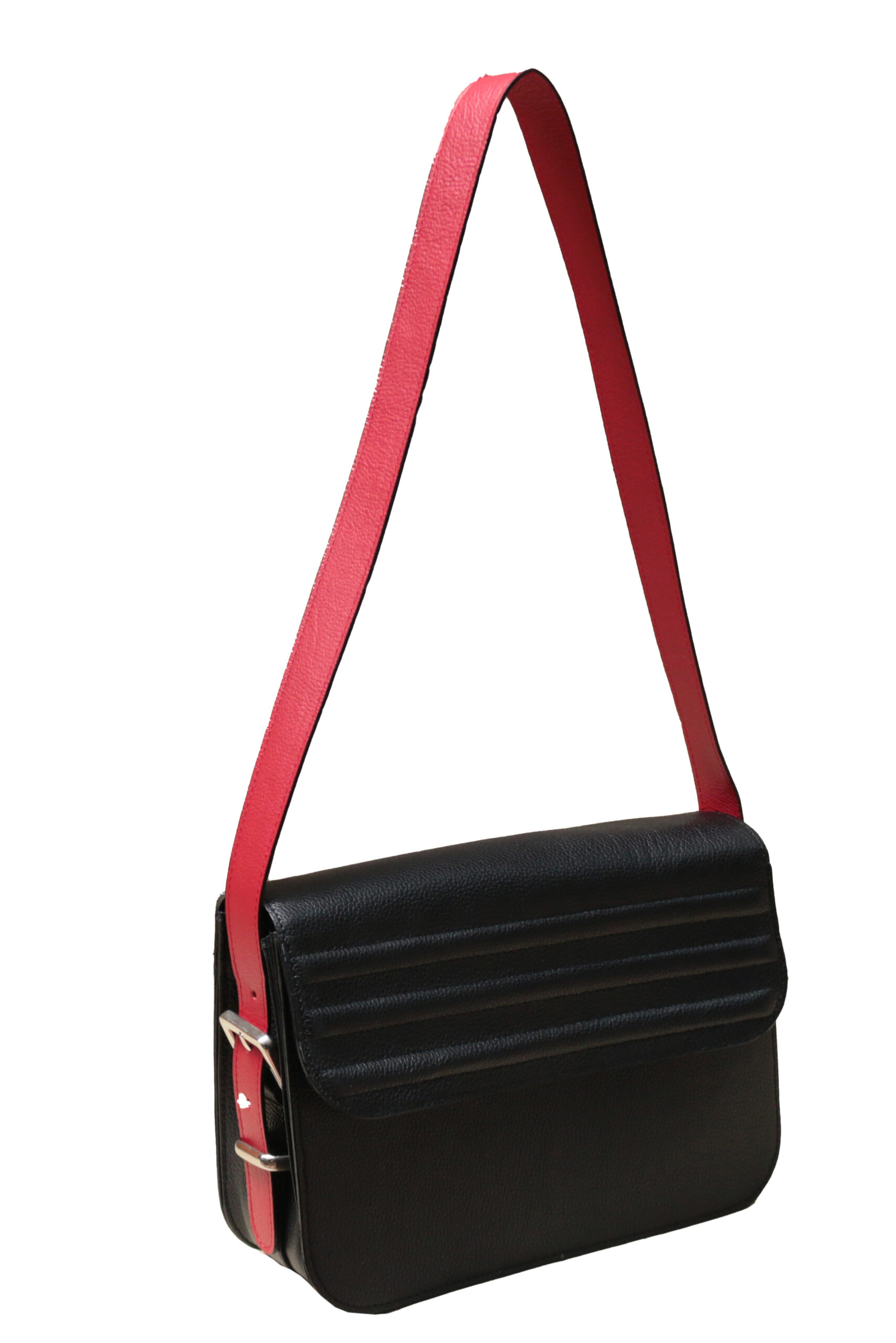 Bolso en cuero napa color negro, tipo baúl, con repujados en el frente, el cierre es con imán y cremallera, para más seguridad. La cargadera es en cuero napa color rojo, combinación que le da alegría al bolso.