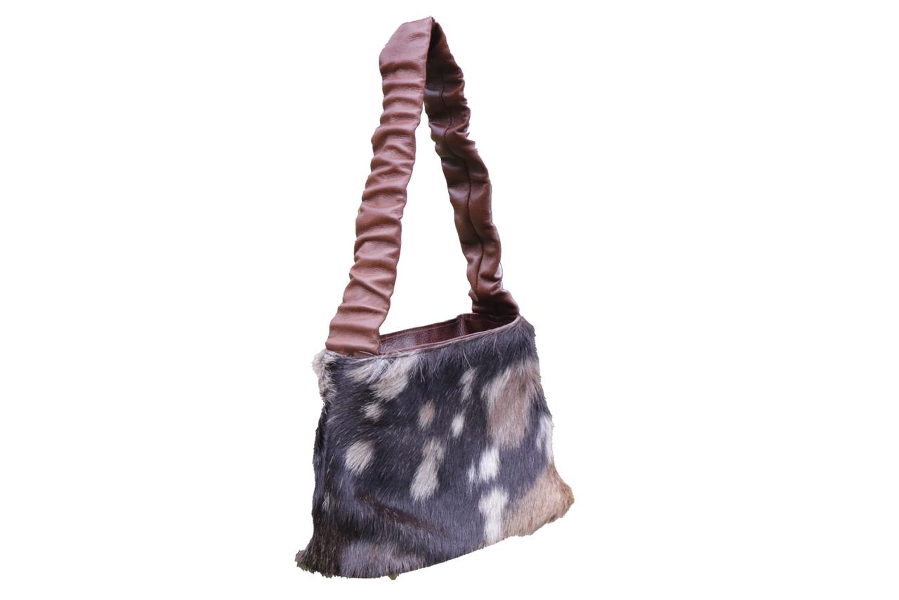 Bolso en cuero de cabrito en pelo, en la gama de los colores café y miel. la manilla de este bolso tiene un detalle especial, es en cuero miel recogido, lo que lo hace diferente y único.