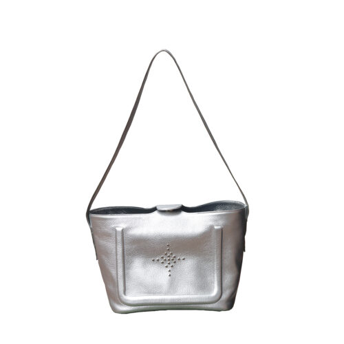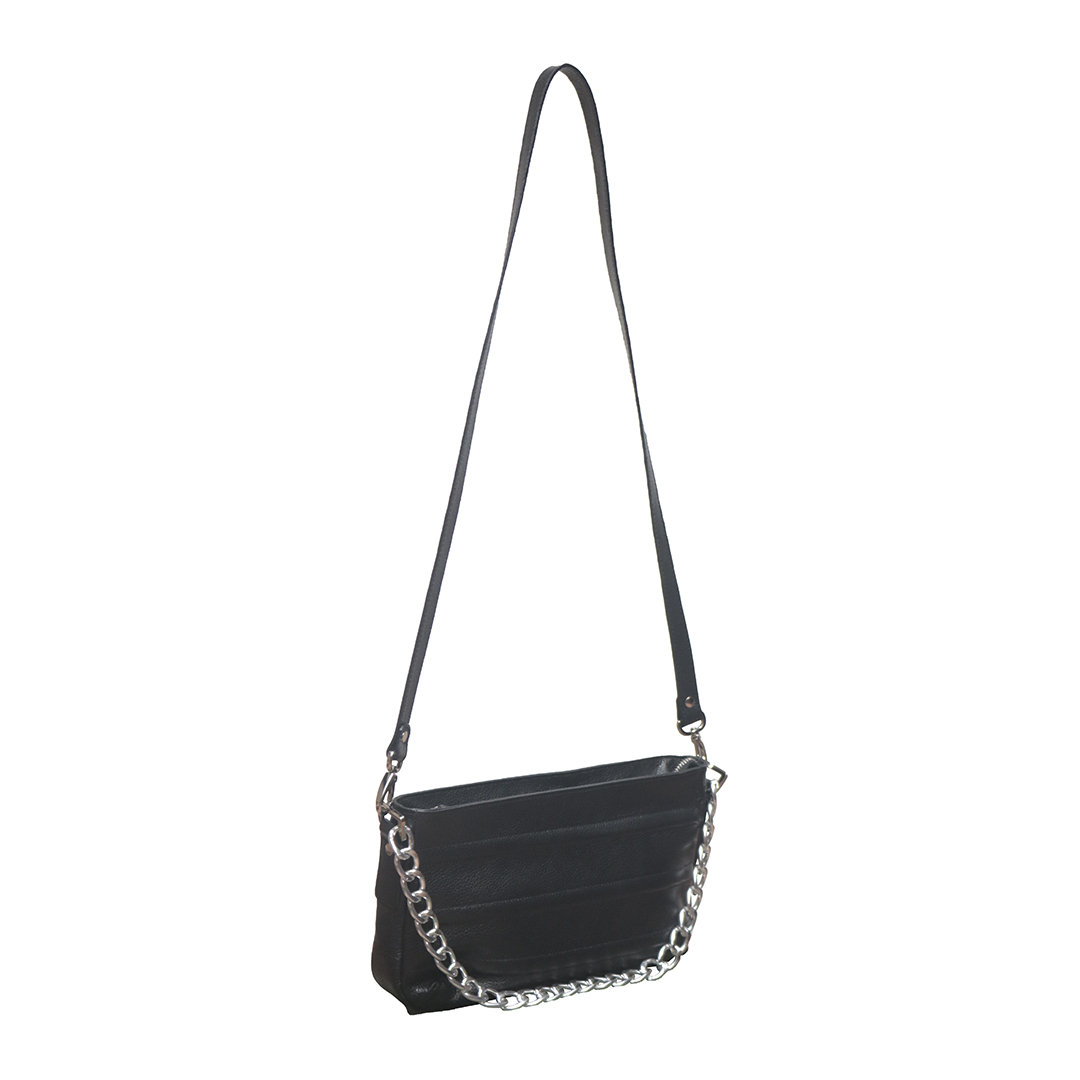 Bolso manos libres en cuero napa color negro, franjas repujadas en el frente. Este manos libres se puede cargar de dos maneras, con la cadena plateada para llevarlo en el brazo y también con cargadera para el hombro en cuero negro, que da la posibilidad incluso de usarlo cruzado.