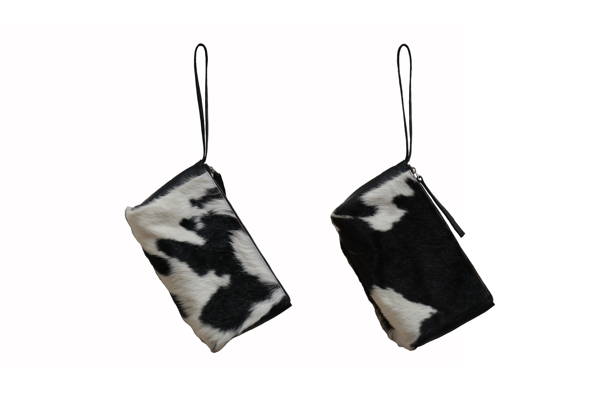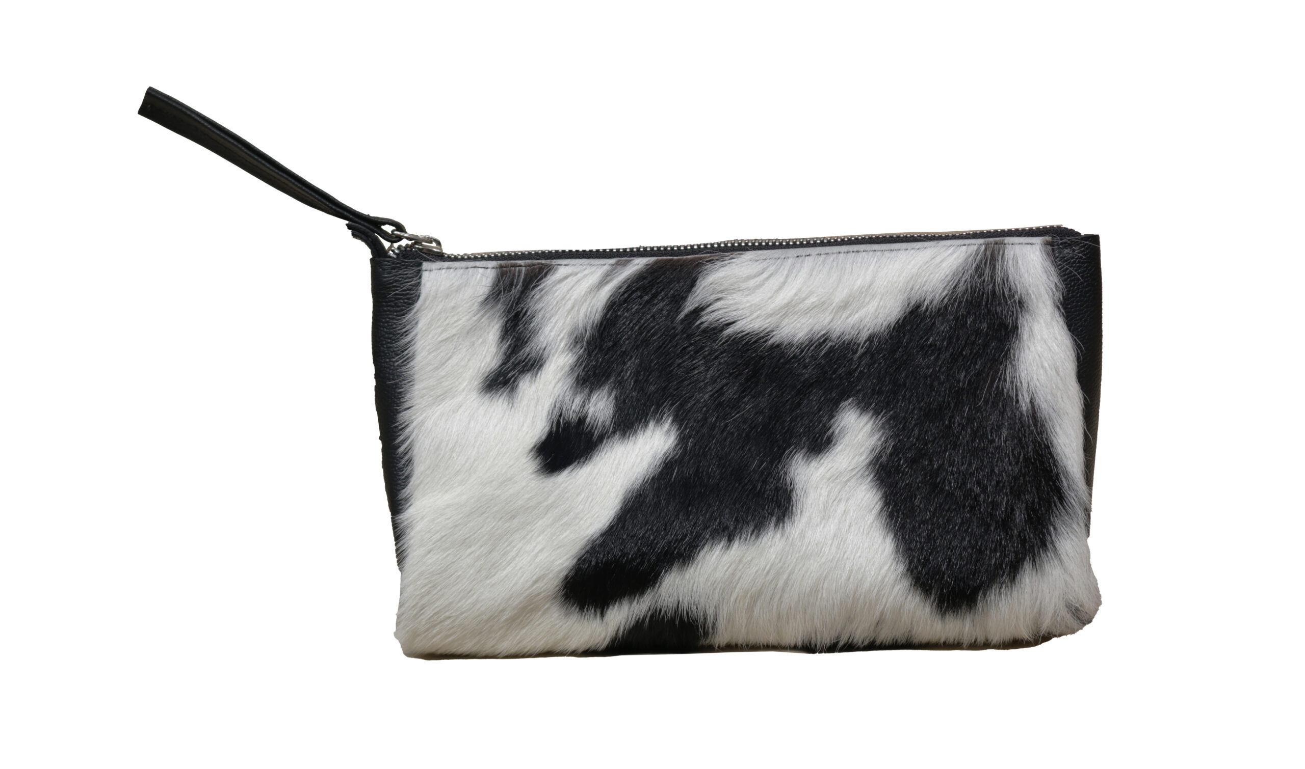 Cosmetiquera en cuero de becerro, en pelo, color negro y blanco. La capacidad de la cosmetiquera permite que incluso la uses como cartera de mano para llevar tu billetera y el celular.